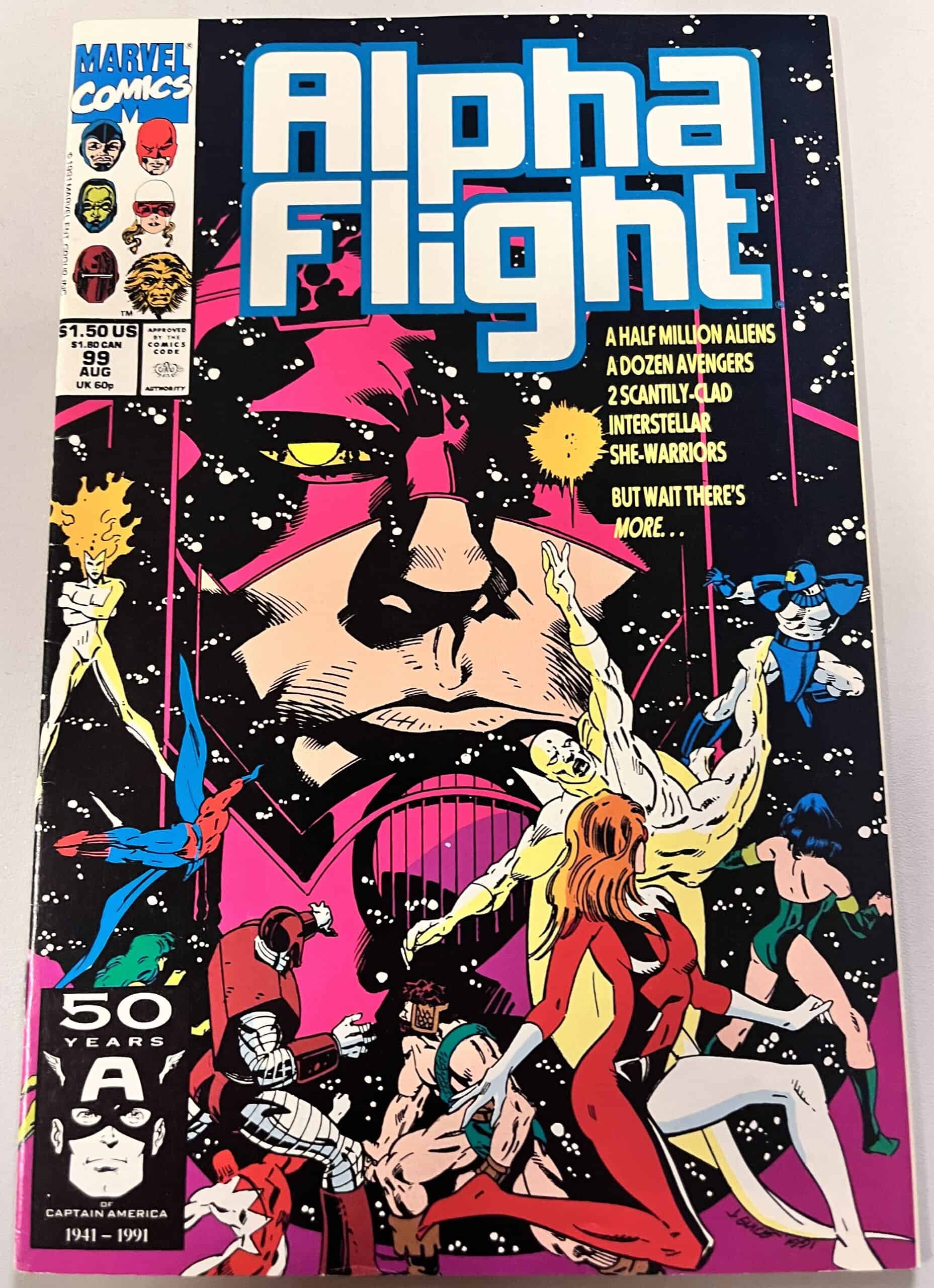 Alpha Flight and the Avengers continue to battle a horde of aliens who are trying to capture Her. Just as they are trying to decide whether to continue the devastating conflict, Vindicator is contacted by the Quwrll whose planet is being menaced by the world-eater Galactus. Vindicator teleports half of both the Alphans and the Avengers across the universe to save the aliens who saved his life by combining him with his suit.