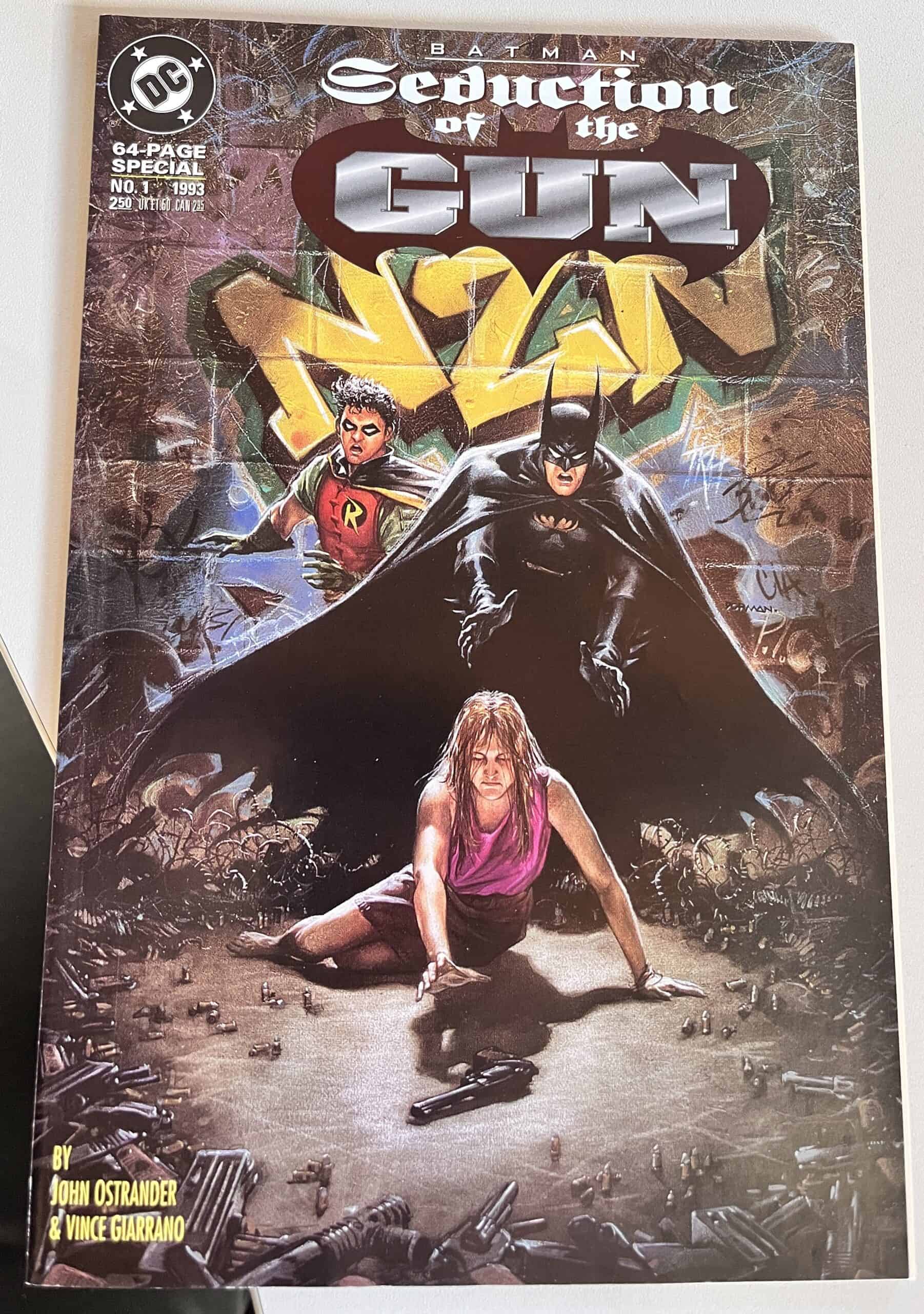 Story: In BATMAN: SEDUCTION OF THE GUN, Batman and Robin confront the issue of gun control head on, in an action-packed and thought-provoking tale of gun-running, gang violence and the insidious lure of firearms.