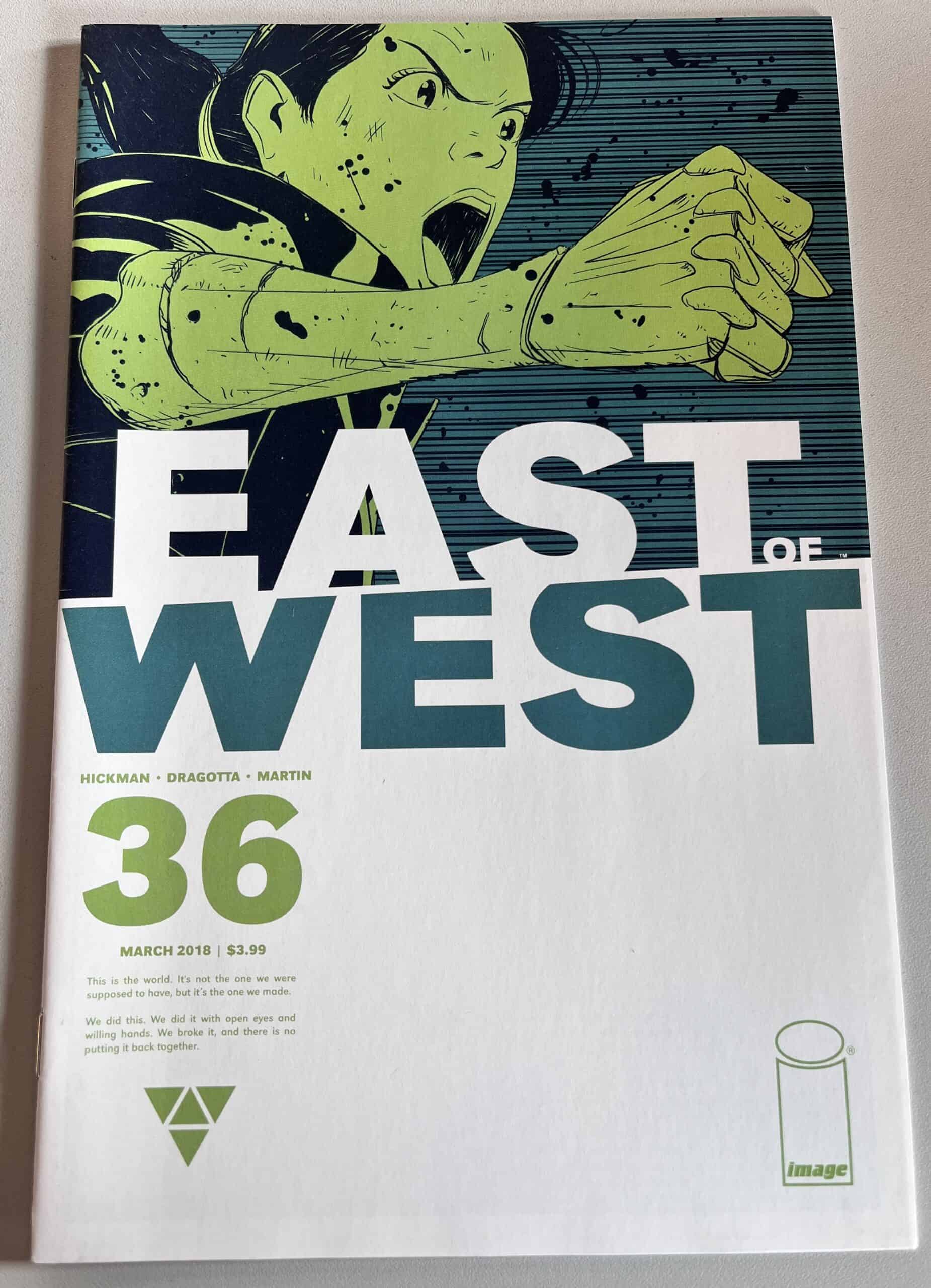 'OUT OF THE WASTELAND' The things that divide us are stronger than the things that unite us. A Sci-Fi Western set in a dystopian America where all hope for the future rests in the Four Horsemen of the Apocalypse…who just happen to be trying to kill the President of the United States. One of the most exciting new books of the year, this is EAST OF WEST, a brand new, ongoing, monthly comic from the award-winning team of Marvel's FF, JONATHAN HICKMAN and NICK DRAGOTTA.