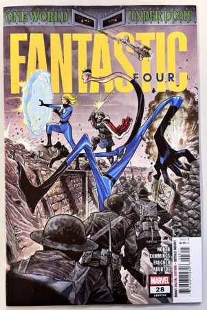 Deze Fantastic Four #28 is gloednieuw en ongelezen!! Komisch script door Ryan North Geïllustreerd door Steven Cummings Omslagontwerp of artwork door Joshua Cassara PROLOOG NAAR EEN WERELD ONDER DOOM! Het is maanden geleden dat Doctor Doom Sorcerer Supreme werd - en verdween. Reed Richards, de slimste man ter wereld, heeft die tijd besteed aan het vinden van een manier om magie te begrijpen, zodat hij Doom kan vinden en stoppen... en dat is hem niet gelukt. Maar als Sue suggereert dat er nog een man is die zowel een diploma natuurkunde heeft als verstand van magie: Dane Whitman, de Zwarte Ridder! - Reed en Sue besluiten te kijken of hij enig inzicht kan bieden. De hulp van Dane stuurt de gedachten van Reed en Sue terug in de tijd – om de lichamen van twee mensen uit het verleden te bezitten, waar ze, zonder hun krachten, op zoek gaan naar het enige magische item dat de illusies van Doom kan doorbreken! Maar de Black Knight heeft zijn eigen motivaties... en het verleden is niet meer wat het was.