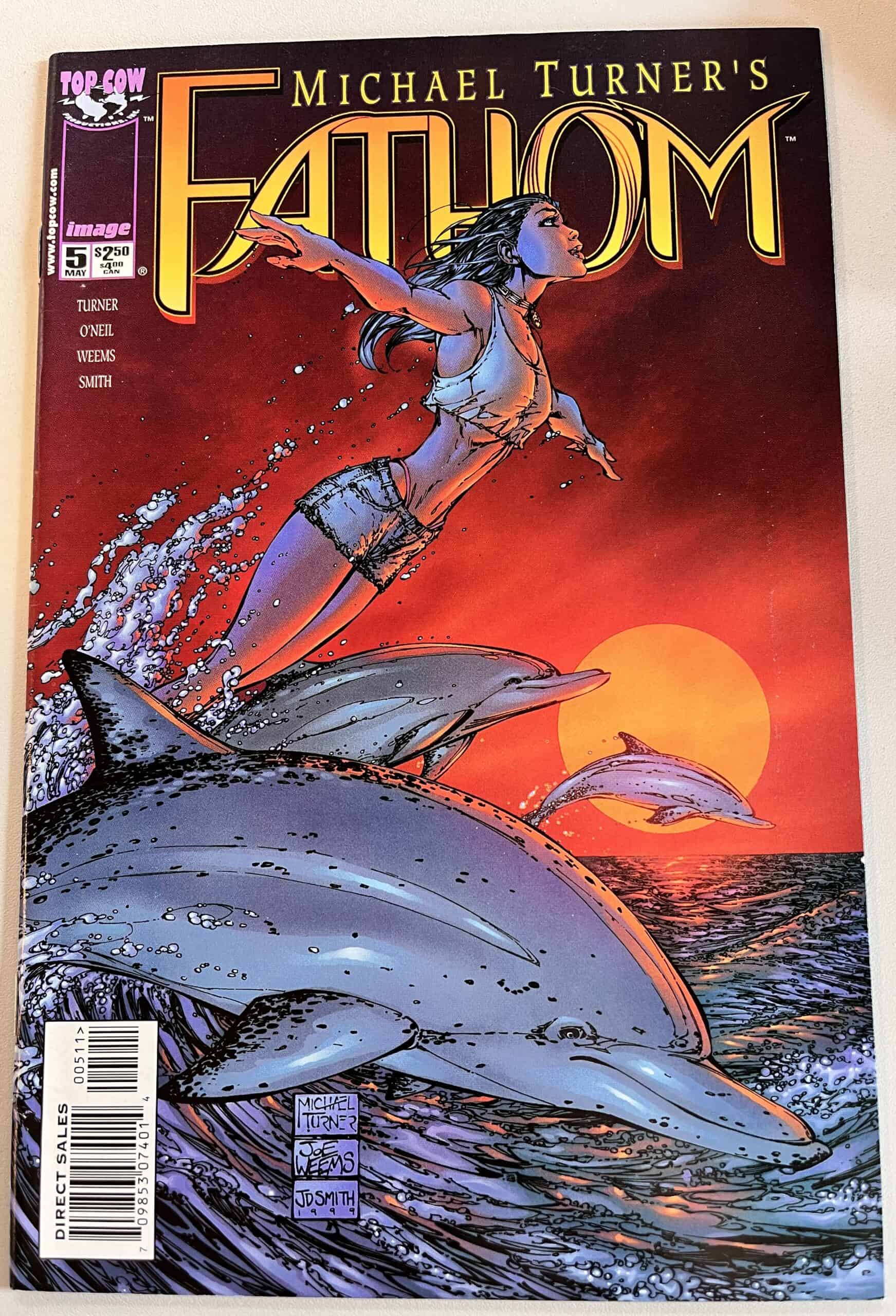 Writer: Michael Turner & Bill O'Neil Penciler: Michael Turner Year: 2000 Story: Fathom begins as the cruise ship Paradise arrives in San Diego 10 years after its disappearance had been reported. A military quarantine is established to cross-examine the crew and passengers; however, no one on board is aware that they had been missing. Compounding the mystery is a girl who had been discovered by the crew while still at sea. The girl could only remember that her name was Aspen. Aspen is taken from the ship by a vacationing naval officer, Captain Matthews, who adopts her and raises her as his own. Aspen has a strange attraction to water, and spends much of her youth swimming, eventually making the US Olympic team for the 1988 Seoul games. She wins the gold, but has her medal taken away and receives a permanent ban after she fails a rigged drug test. Afterwards, Aspen attends UC San Diego and receives a degree in Marine Biology. She is then invited to study at a top-secret underwater science facility known as the DMD, or Deep Marine Discovery. The DMD is a joint project between the United States and Japan. The facility was built over a strange underwater craft of unknown origin which both nations study to determine its origin. However, the Americans and Japanese no longer trust each other and rely on an intermediary named Cannon Hawke to share research data. Aspen is also introduced to a mysterious man who somehow entered the DMD and requested to be placed into a tube filled with water. He requires no air, leading the DMD to deduce that, despite his appearance, he is not human. A US Navy test pilot named Chance Calloway is testing an experimental amphibious fighter plane for Admiral Maylander, who heads Naval Intelligence. Maylander is also the man who oversaw the quarantine of the Paradise. Chance's wingman is killed by a craft resembling the one at the DMD. Violating orders, Chance pursues the craft, first in the air and then underwater. Again disobeying orders, he fires a torpedo at the craft only to have it dissolve into the water before the torpedo reaches its target. Without a target, the torpedo locks onto the generator at the DMD and destroys it, severely damaging the facility. Before she drowns, Aspen is rescued by the man in the tube who springs to life and attempts to take her with him. He begins to dissolve into the water, just like the alien craft, and Aspen begins to dissolve as well. Naval rescue teams arrive and the man flees: Aspen is rescued, but not before Calloway sees her in a half-dissolved form. He goes AWOL to try to find Aspen and figure out what he saw. He eventually finds Aspen, who cannot explain her abilities. Before she can find out any more, she is abducted by government personnel and brought to Killian who is held in the DMD. He tells Aspen that she is a member of a race of aquatic humanoids called the Blue who possess the ability to control water.The book is in excellent condition, Near Mint