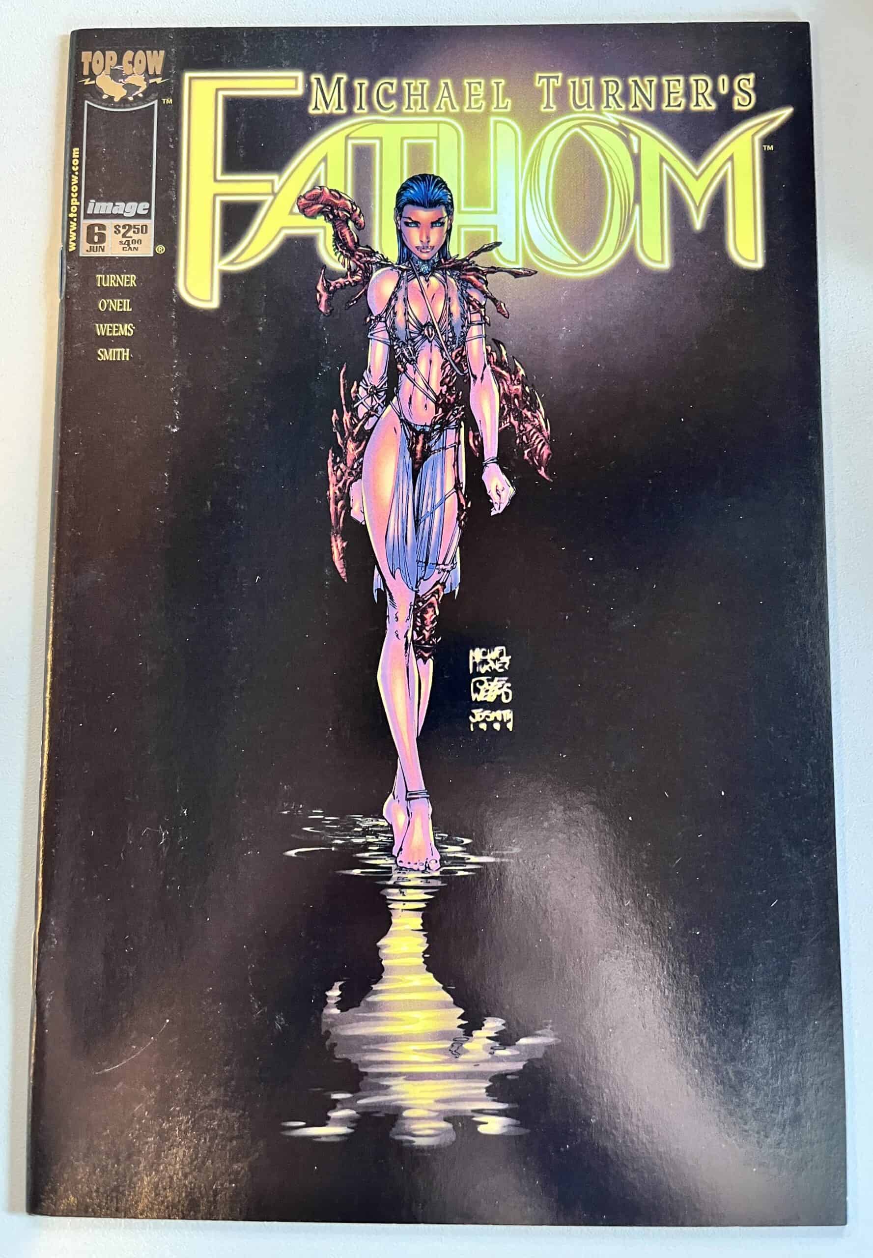 Writer: Michael Turner & Bill O'Neil Penciler: Michael Turner Year: 2000 Story: Fathom begins as the cruise ship Paradise arrives in San Diego 10 years after its disappearance had been reported. A military quarantine is established to cross-examine the crew and passengers; however, no one on board is aware that they had been missing. Compounding the mystery is a girl who had been discovered by the crew while still at sea. The girl could only remember that her name was Aspen. Aspen is taken from the ship by a vacationing naval officer, Captain Matthews, who adopts her and raises her as his own. Aspen has a strange attraction to water, and spends much of her youth swimming, eventually making the US Olympic team for the 1988 Seoul games. She wins the gold, but has her medal taken away and receives a permanent ban after she fails a rigged drug test. Afterwards, Aspen attends UC San Diego and receives a degree in Marine Biology. She is then invited to study at a top-secret underwater science facility known as the DMD, or Deep Marine Discovery. The DMD is a joint project between the United States and Japan. The facility was built over a strange underwater craft of unknown origin which both nations study to determine its origin. However, the Americans and Japanese no longer trust each other and rely on an intermediary named Cannon Hawke to share research data. Aspen is also introduced to a mysterious man who somehow entered the DMD and requested to be placed into a tube filled with water. He requires no air, leading the DMD to deduce that, despite his appearance, he is not human. A US Navy test pilot named Chance Calloway is testing an experimental amphibious fighter plane for Admiral Maylander, who heads Naval Intelligence. Maylander is also the man who oversaw the quarantine of the Paradise. Chance's wingman is killed by a craft resembling the one at the DMD. Violating orders, Chance pursues the craft, first in the air and then underwater. Again disobeying orders, he fires a torpedo at the craft only to have it dissolve into the water before the torpedo reaches its target. Without a target, the torpedo locks onto the generator at the DMD and destroys it, severely damaging the facility. Before she drowns, Aspen is rescued by the man in the tube who springs to life and attempts to take her with him. He begins to dissolve into the water, just like the alien craft, and Aspen begins to dissolve as well. Naval rescue teams arrive and the man flees: Aspen is rescued, but not before Calloway sees her in a half-dissolved form. He goes AWOL to try to find Aspen and figure out what he saw. He eventually finds Aspen, who cannot explain her abilities. Before she can find out any more, she is abducted by government personnel and brought to Killian who is held in the DMD. He tells Aspen that she is a member of a race of aquatic humanoids called the Blue who possess the ability to control water.The book is in excellent condition, Near Mint