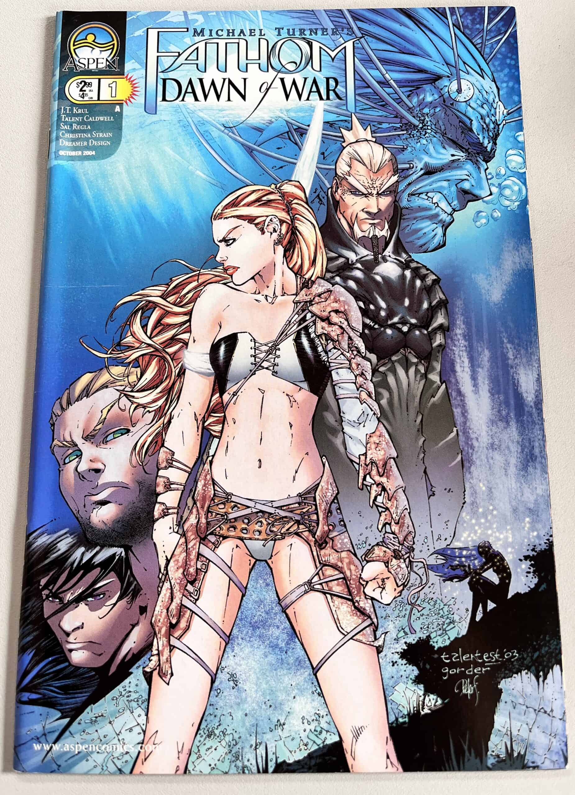 Writer: J.T. Krul Penciler: Talent Caldwell Year: 2004 Story: Fathom: Dawn of War bridges the gap between the original series and Fathom vol. 2. The story focuses on the Blue warrior Kiani, who is forced to side with the rebellious councilman Marqueses in order to save her master, Casque, from the clutches of human military scientists. Marqueses has engineered the situation in order to kidnap Casque and to secure the older warrior's immense power for an offensive against the humans. Kiani tracks down Marqueses and saves Casque only to find he is part of the Black. The Black come for Casque, and he is forced to rejoin them, leaving Kiani angry and lost. Dawn of War emphasizes Kiani's loneliness and character development. It also introduces audiences further to the underwater world of the Blue.The book is in excellent condition, Near Mint