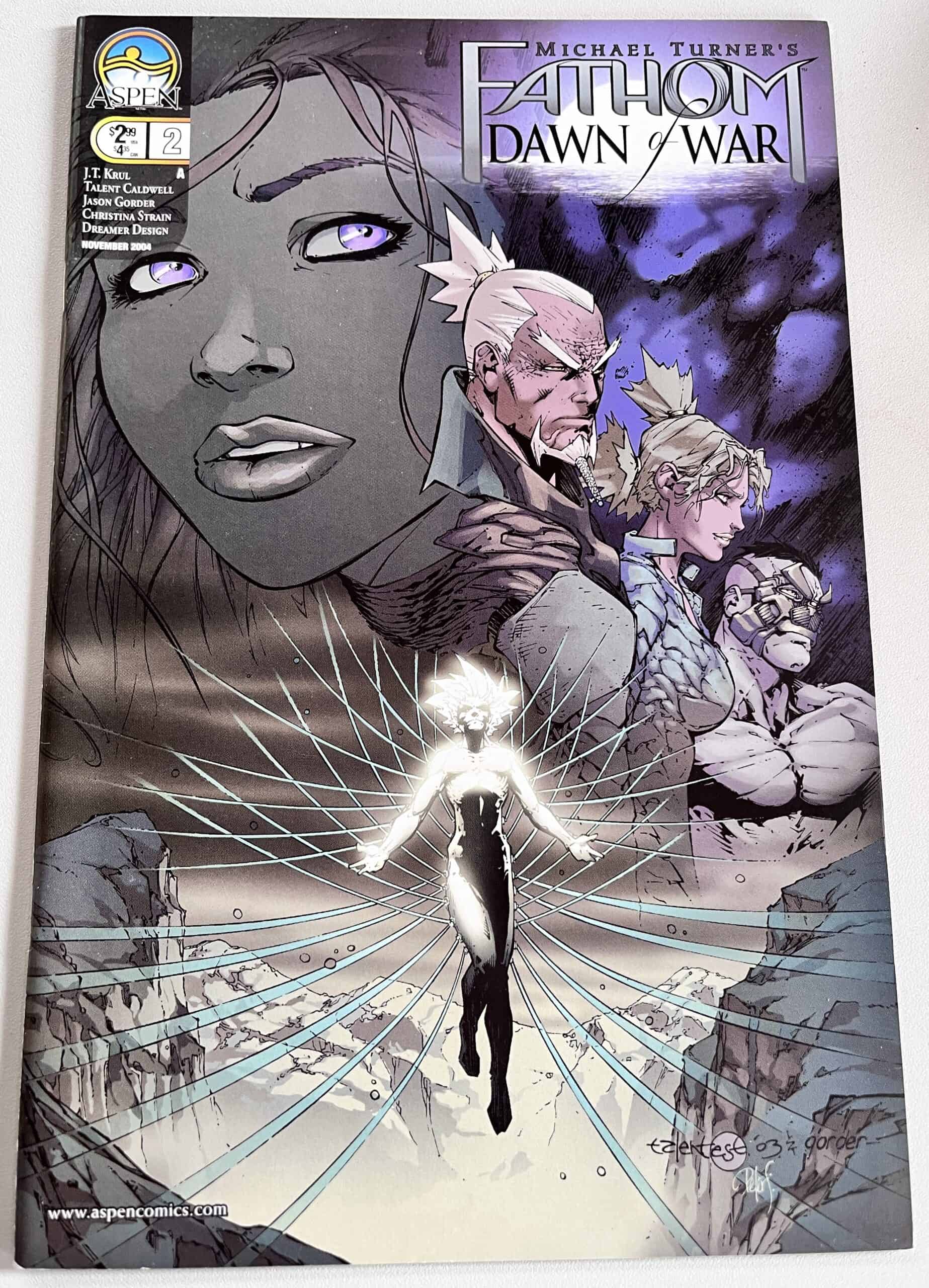 Writer: J.T. Krul Penciler: Talent Caldwell Year: 2004 Story: Fathom: Dawn of War bridges the gap between the original series and Fathom vol. 2. The story focuses on the Blue warrior Kiani, who is forced to side with the rebellious councilman Marqueses in order to save her master, Casque, from the clutches of human military scientists. Marqueses has engineered the situation in order to kidnap Casque and to secure the older warrior's immense power for an offensive against the humans. Kiani tracks down Marqueses and saves Casque only to find he is part of the Black. The Black come for Casque, and he is forced to rejoin them, leaving Kiani angry and lost. Dawn of War emphasizes Kiani's loneliness and character development. It also introduces audiences further to the underwater world of the Blue.The book is in excellent condition, Near Mint