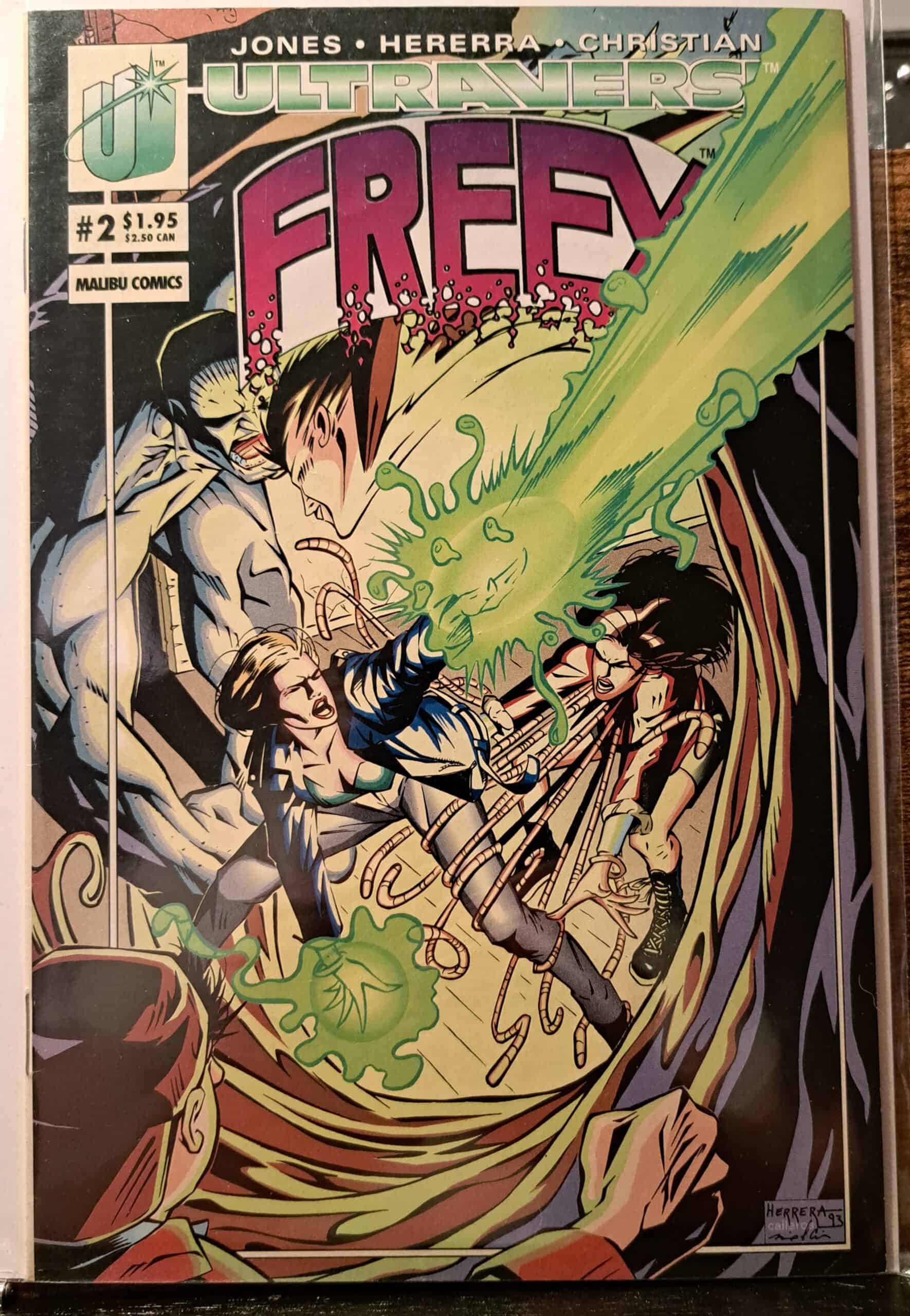 Short-lived comic book series from created by Gerard Jones and Ben Herrera. It concerned a team of runaway teenage superheroes. The group that would come to call themselves the Freex were apparently created when a group of newborn infants were injected with a substance called “wetware”, a mix of mutated DNA and nanotechnology that had been created by the advanced but isolated underground society called the Fire People. The nurse who injected these children would later go on to become the superhero Contrary, who utilized other Fire People technology to assist and organize Ultraforce.