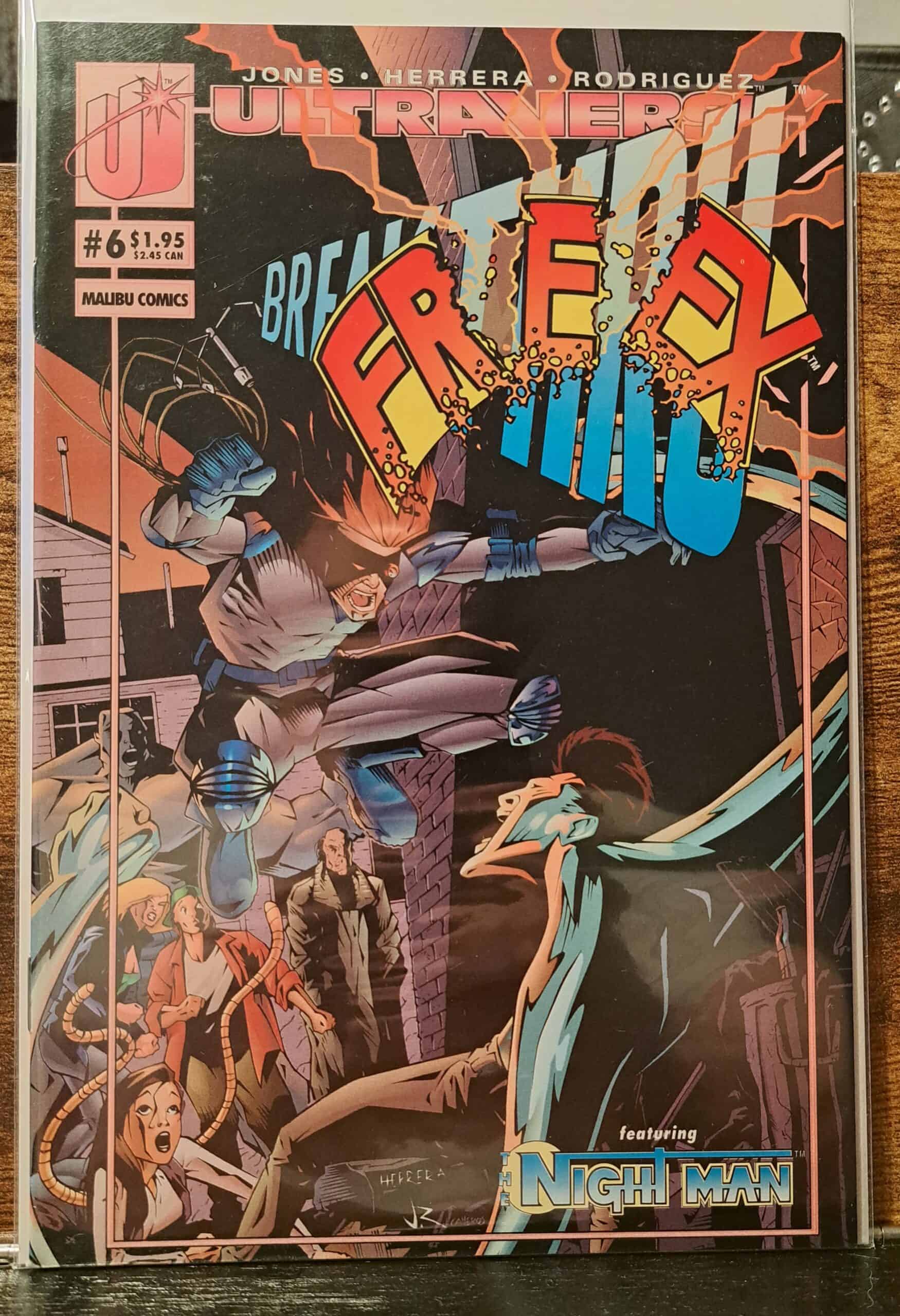 Short-lived comic book series from created by Gerard Jones and Ben Herrera. It concerned a team of runaway teenage superheroes. The group that would come to call themselves the Freex were apparently created when a group of newborn infants were injected with a substance called “wetware”, a mix of mutated DNA and nanotechnology that had been created by the advanced but isolated underground society called the Fire People. The nurse who injected these children would later go on to become the superhero Contrary, who utilized other Fire People technology to assist and organize Ultraforce.