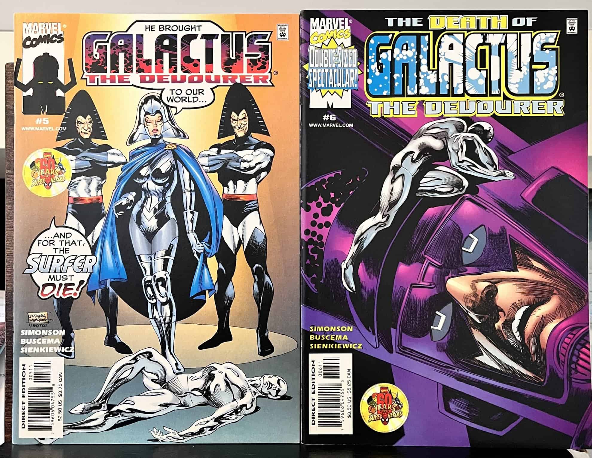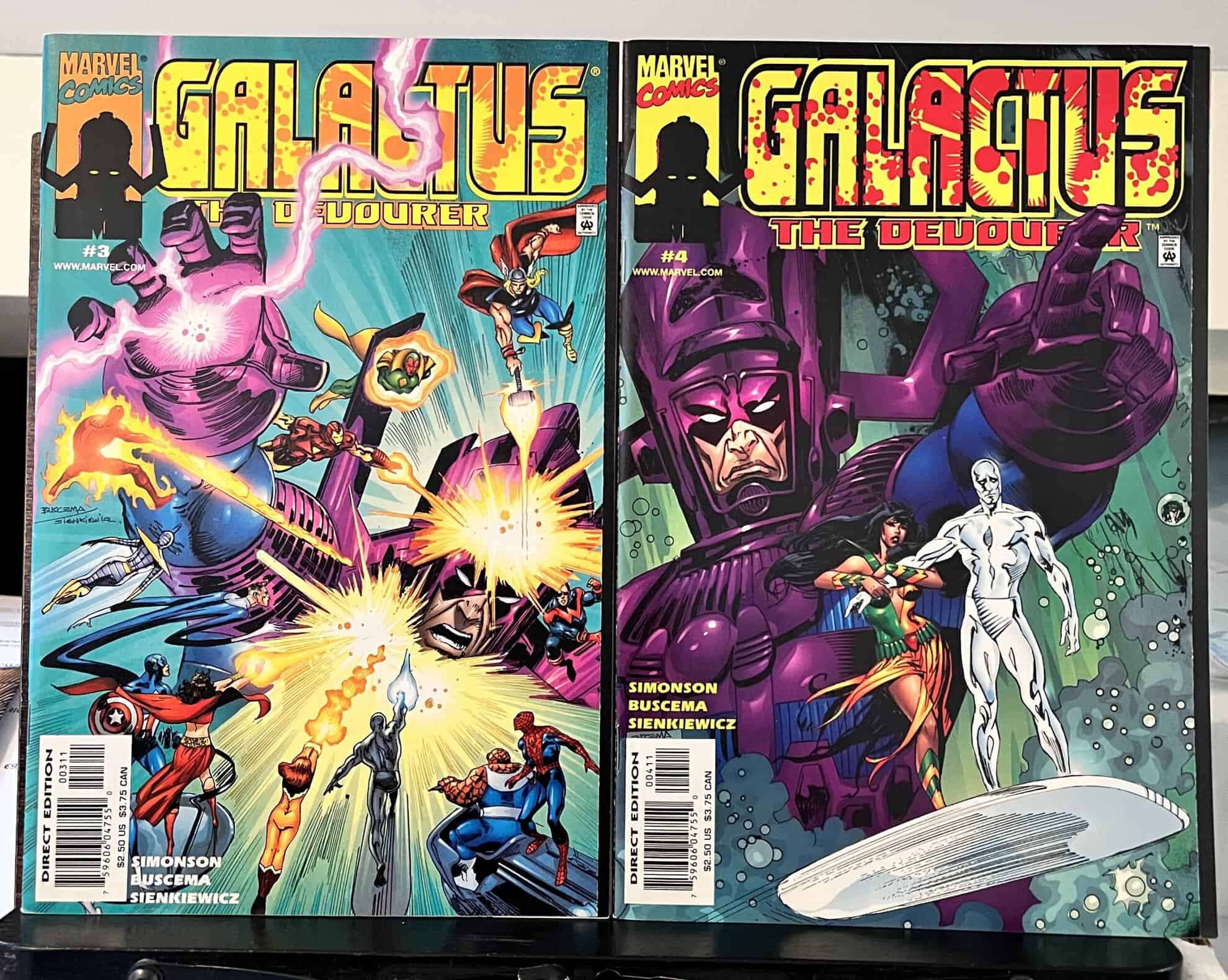 Galactus eats another world & some inhabitants escape. Alicia Master’s new boyfriend, the Silver Surfer, helps her set up for an art show of her sculptures. During the event, Mole Man tries to provoke a fight between the Surfer & Alicia’s old boyfriend, the Thing. During the battle, Alicia manifests her cosmic armor. The FF & Avengers go after the Mole Man who is stealing a waste treatment plant. During the conflict, a large meteor threatens to flatten New York but the Surfer risks his life to deflect it. The meteor turns out to be a ship with a dying alien inside claiming, “He’s coming.”