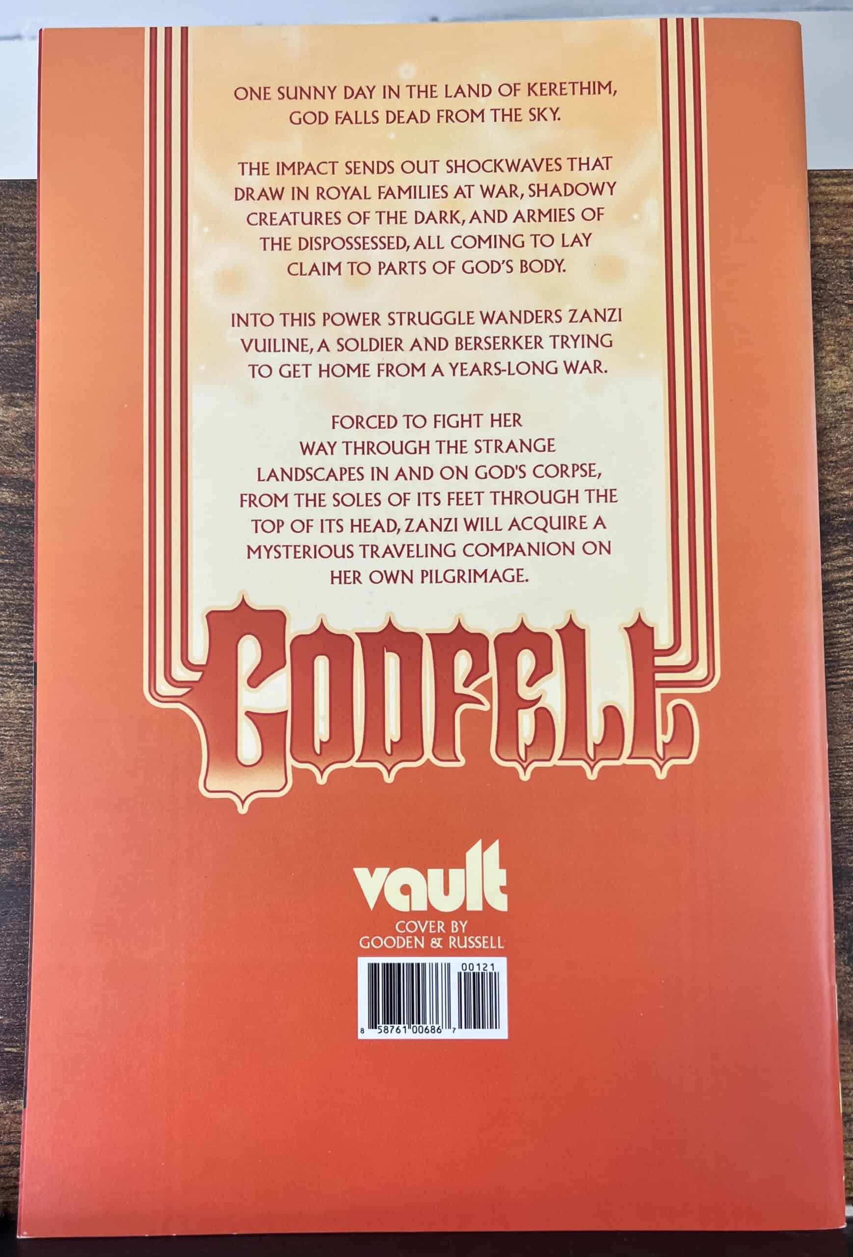 One sunny day in the land of Kerethim, God falls dead from the sky. The impact sends out shockwaves that draw in royal families at war, shadowy creatures of the dark, and armies of the dispossessed, all coming to lay claim to parts of God’s body. Into this power struggle wanders Zanzi Vuiline, a soldier and berserker trying to get home from a years-long war. Forced to fight her way through the strange landscapes in and on God’s corpse, from the soles of its feet through the top of its head, Zanzi will acquire a mysterious traveling companion on her own pilgrimage.