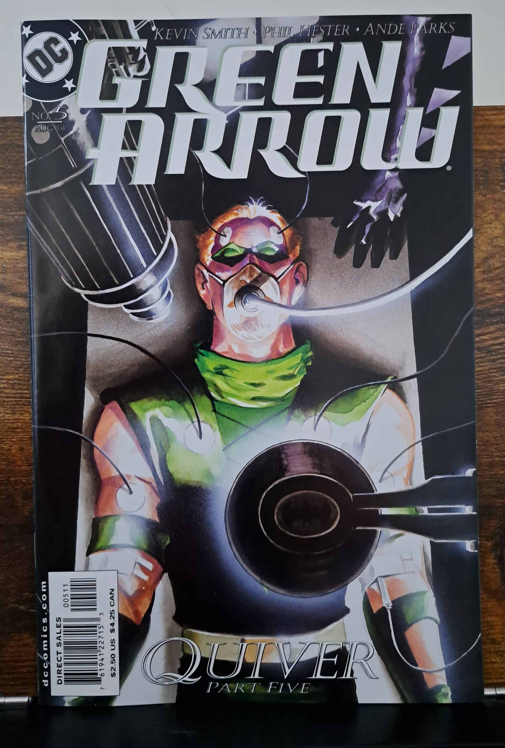 Deze Groene Pijl vol. 3 #5 stripboek is van hoge kwaliteit, zeer fijn/bijna nieuwstaat Schrijver: Kevin Smith Tekenaar: Phil Hester Jaar: 2001 Batman geeft GA een grondig onderzoek en strenge ondervragingen om te bepalen of hij de echte deal is (en toont hem het bewijs van zijn dood en zijn ontmoeting met Parallax). Batman komt erachter wanneer Ollie's herinneringen ophielden. Canary en Roy verschijnen bij Dover op zoek naar Ollie. De demon verschijnt op het landgoed van de koningin om de niet-dode GA te doden.