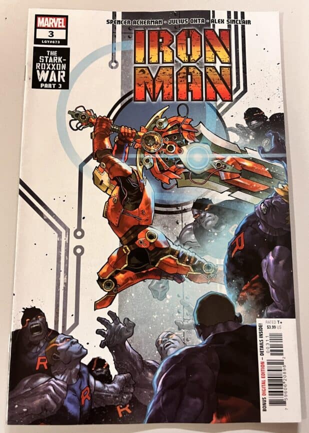 Deze Iron Man #3 is gloednieuw en ongelezen! Onderdeel van IRON MAN Komisch script van Spencer Ackerman Geïllustreerd door Julius Ohta, Jethro Morales Omslagontwerp of artwork door Yasmine Putri IRON MAN GAAT MIDDELEEUWS! Het is de IJzeren Zwaardvechter versus de IJzeren Monger! Wanhopig om Stark Unlimited uit de handen van Roxxon en A.I.M. te houden, stopte Tony met het uithalen van stoten. Maar sabotageaanvallen brengen hem nergens, terwijl de stemming in het bestuur op volle toeren verloopt. En als hij erachter komt wie ECHT achter de overnamepogingen zit, breekt de hel los. Het duistere geheim van de Iron Monger zal worden onthuld in het laatste hoofdstuk van “the Stark-Roxxon War”!