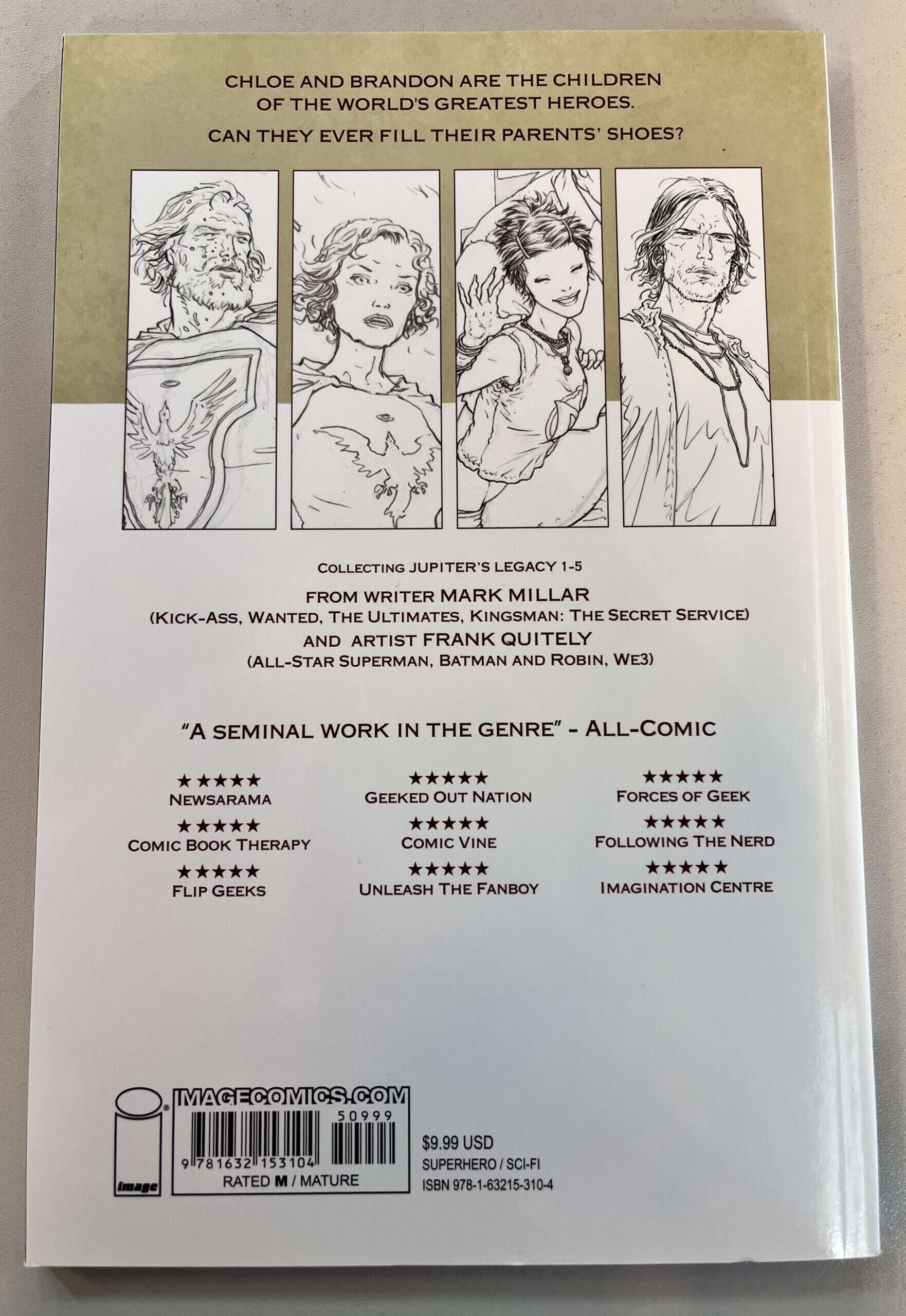 Deze Jupiter’s Legacy tradepaperback is in uitstekende staat, bijna als nieuw Verhaal: Mark Millar Tekenaar: Frank Quietly Jaar: 2015 Taal: Engels De kinderen van de grootste superhelden ter wereld zullen wellicht nooit de schoenen van hun ouders kunnen vullen. Wanneer de familie verwikkeld raakt in een onderlinge strijd, komt de ene tak in opstand en duikt de andere onder. Hoe lang kan de wereld overleven als de superkrachtige problemen van één familie op het wereldtoneel exploderen? Net op tijd voor de lancering van de prequelserie JUPITER’S CIRCLE komt deze verzamelde editie van verhalenvertellers MILLAR en QUITELY. Verzamelt JUPITER’S ERFENIS #1-5