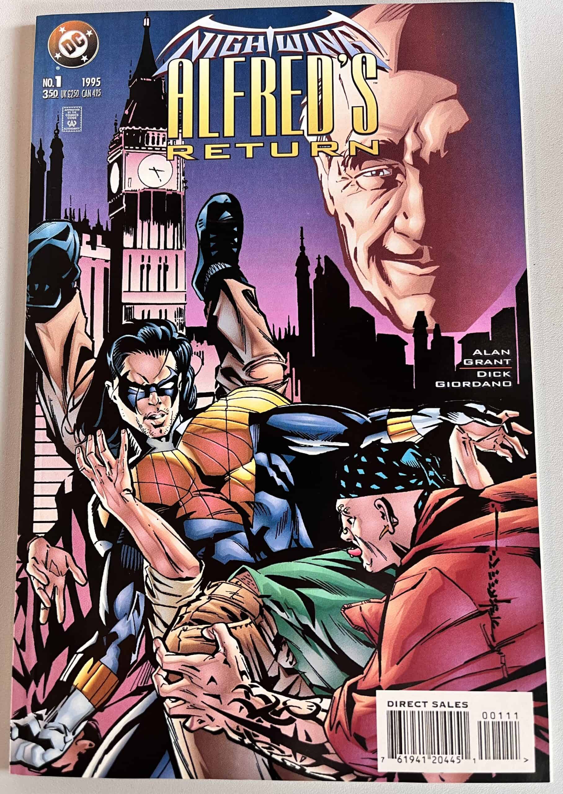 Nightwing: Alfred’s Return is a one-shot prelude to the Nightwing mini series. Dick Grayson travels to London to rescue Alfred after the events of KnightsEnd. It is written by Alan Grant and drawn by Dick Giordano.