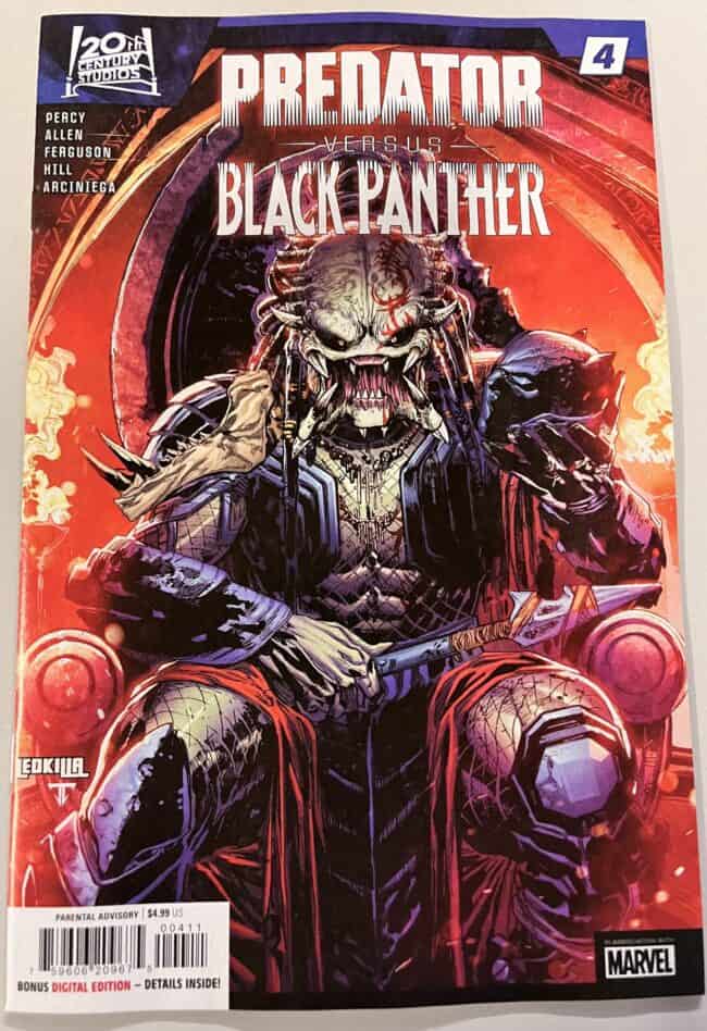 A KING PREDATOR TAKES THE WAKANDAN THRONE?! The invading Predator clan takes their final trophies! They think they’ve defeated the king of Wakanda, but they’ve forgotten he’s not the only royalty who can wield a spear… Princess Shuri recruits a surprising ally as she infiltrates the shadows of her own city! Meanwhile, T’Challa turns the jungle to his advantage. Don’t miss the conclusion of Benjamin Percy’s latest Predator epic and the next step in the Predators’ plans for Earth! RATED PARENTAL ADVISORY.