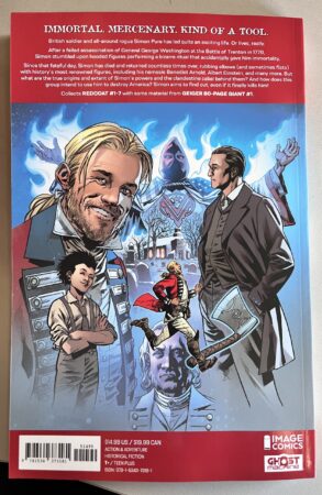 IMMORTAL. MERCENARY. KIND OF A TOOL. British soldier and all-around rogue Simon Pure has led quite an exciting life. Or lives, really. After a failed assassination of General George Washington at the Battle of Trenton in 1776, Simon stumbled upon hooded figures performing a bizarre ritual that accidentally gave him immortality. Since that fateful day, Simon has died and returned countless times over, rubbing elbows (and sometimes fists) with history’s most renowned figures, including his nemesis Benedict Arnold, Albert Einstein, and many more. But what are the true origins and extent of Simon’s power, and the clandestine cabal behind them? And how does this group intend to use him to destroy America? Simon means to find out, even if it finally kills him! Collects REDCOAT #1-7, with some material from GEIGER 80-PAGE GIANT