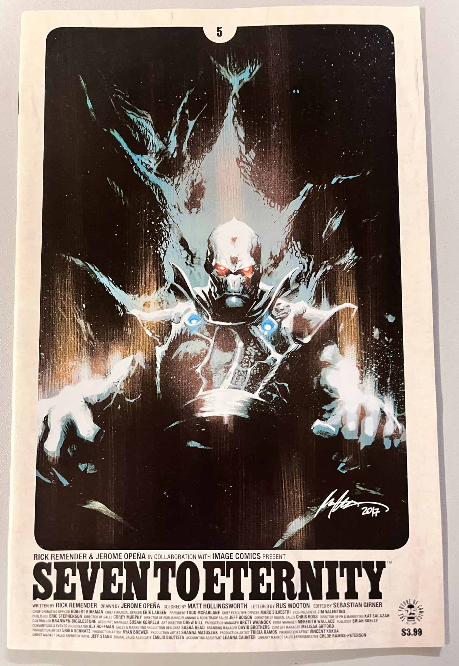 Dit stripboek Seven to Eternity # 5 is in uitstekende staat, Near Mint Schrijver: Rick Remender Kunst: Jerome Opena Jaar: 2017 NIEUWE VERHAALBOOG! Adam Osidis en de Mosak komen op een kruispunt. De keuzes die ze hier maken zullen tot in de eeuwigheid door het hele land van Zhal weerklinken.