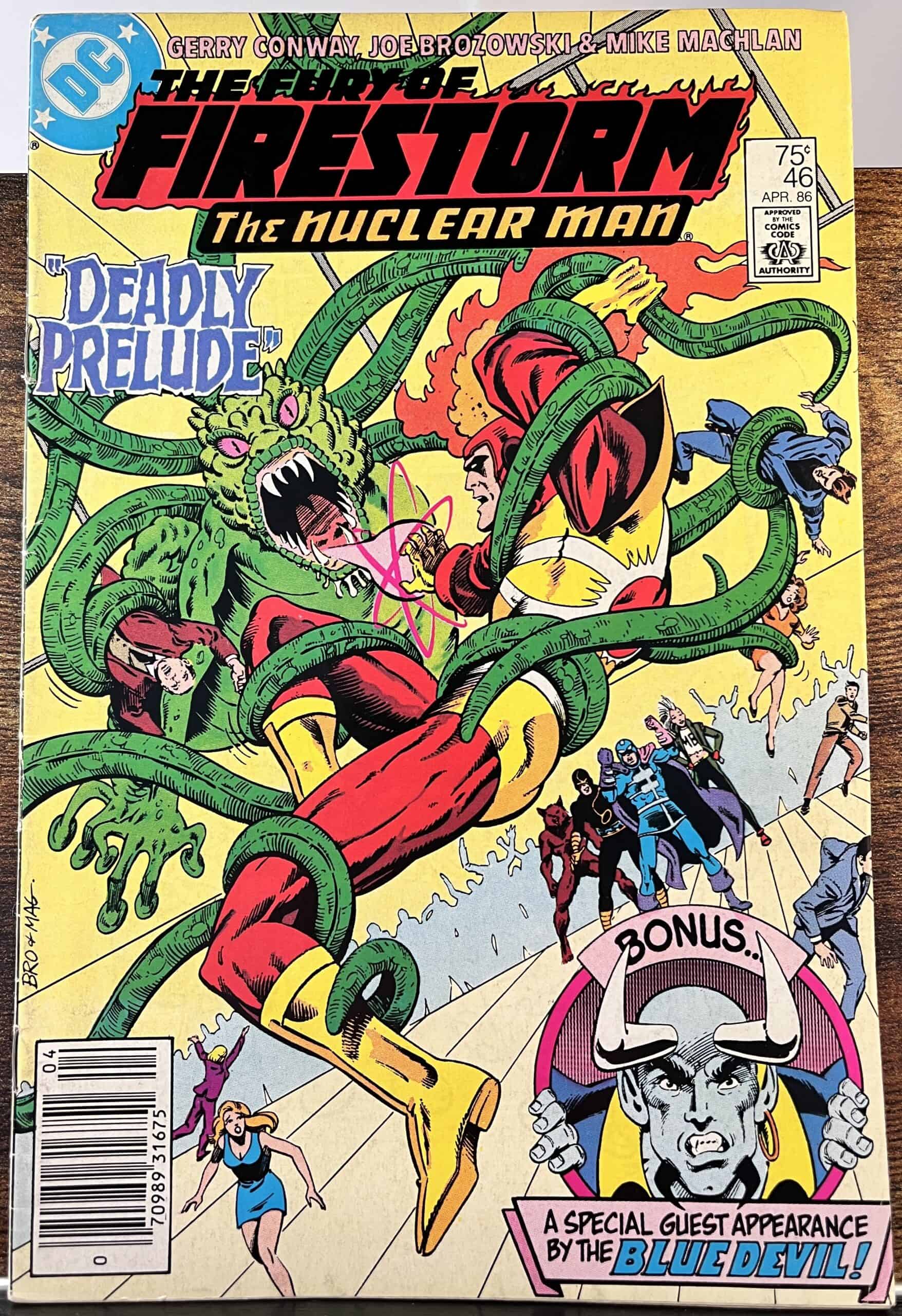 According to indicia, the official title of the series was The Fury of Firestorm from issues #1-64, Firestorm the Nuclear Man from #65-92, and Firestorm (Volume 2) from #93-100. For simplicity’s sake, the series is indexed as simply Firestorm (Volume 2).