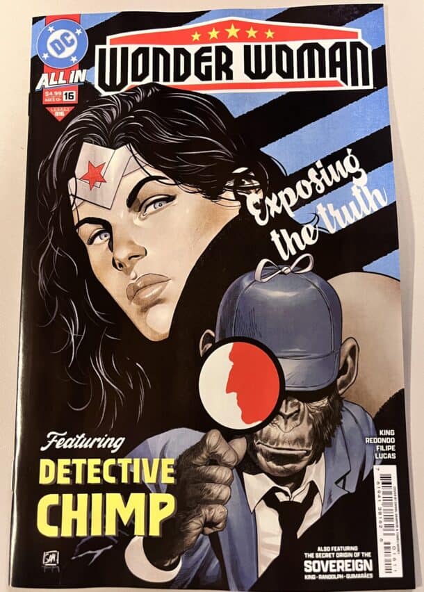 Wonder Woman # 16 is nieuw en ongelezen, Near Mint (W) Tom King (A) Bruno Redondo – Khary Randolph (CA) Daniel Sampere Terwijl de oorlog tegen Sovereign woedt, vertrouwt de nieuwe moeder, Wonder Woman, op haar bondgenoten om deze schijnbaar onwrikbare slechterik weg te werken. Zijn grootste wapen is zijn anonimiteit, maar nu is het tijd om de waarheid bloot te leggen met de talenten van de grootste detective in het DC-universum. Rechercheur Chimp komt in actie voor dit bananenavontuur!